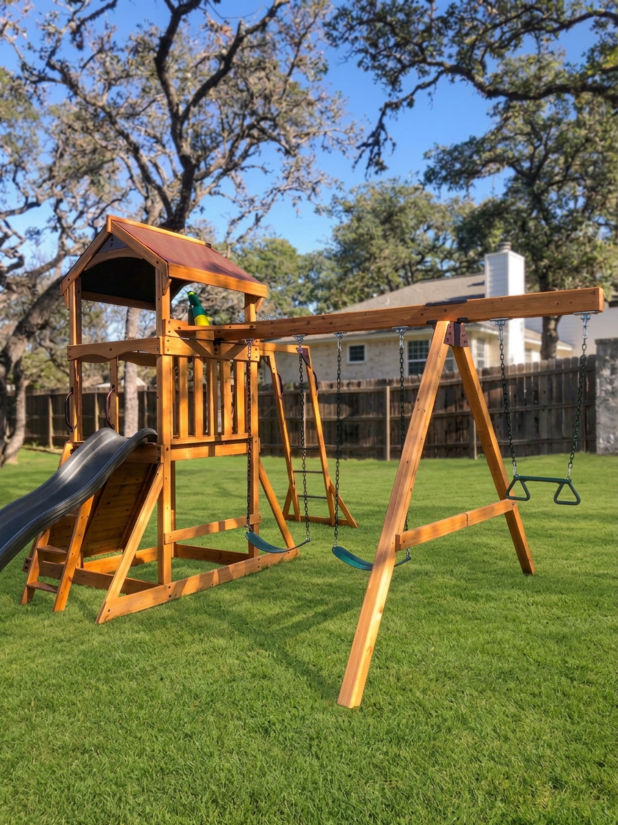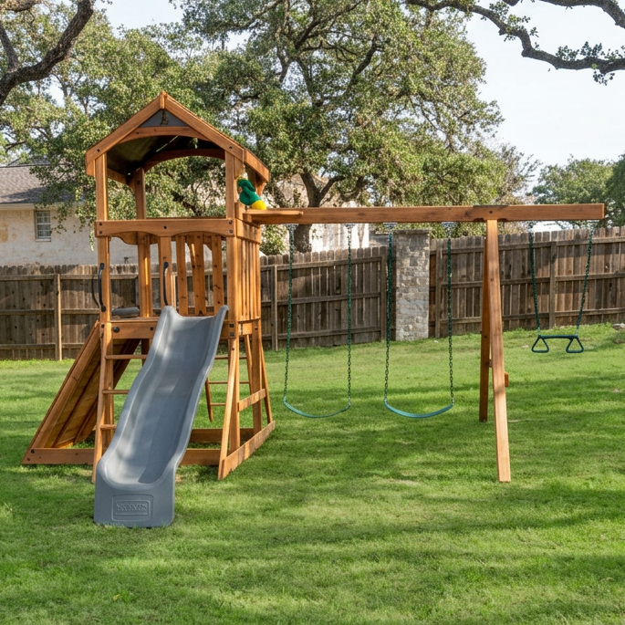 The Grand Chateau playset by Backyard Adventures is one of the most popular wooden playsets for families who want to turn their backyard into a place where kids can climb, swing, slide, and play for years. At Johnny’s Backyard in San Antonio, we help families choose the right playset and handle professional installation so the Grand Chateau playset becomes a safe and exciting centerpiece for backyard fun.